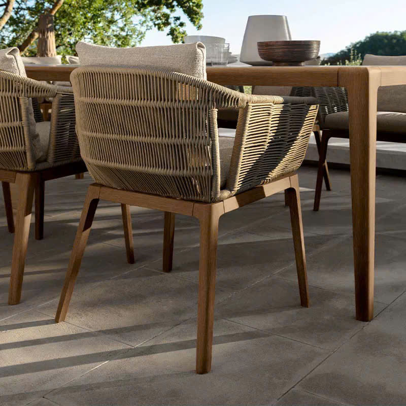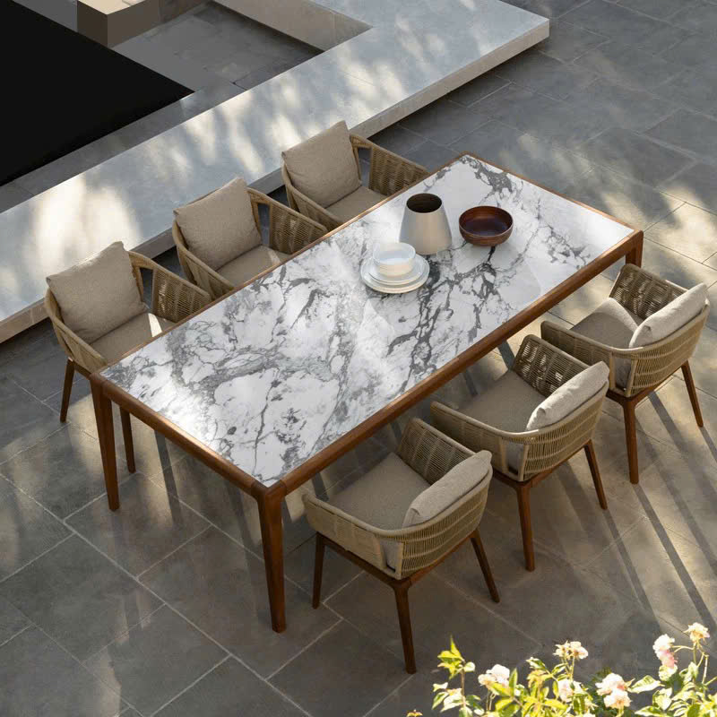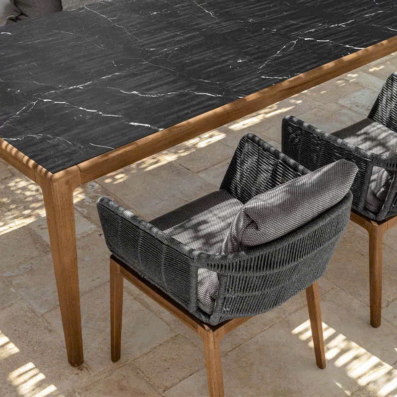 Chất liệu: Gỗ Teak + bọc vải chống nước + dây dệt oliven chống mài mòn + mặt bàn đá